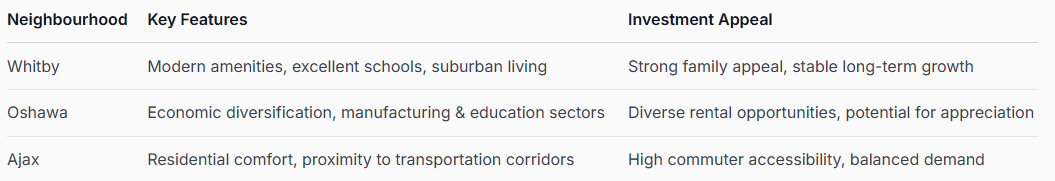 Here is a comparison table outlining the distinct features of Durham Region's key neighbourhoods for investors and homebuyers: