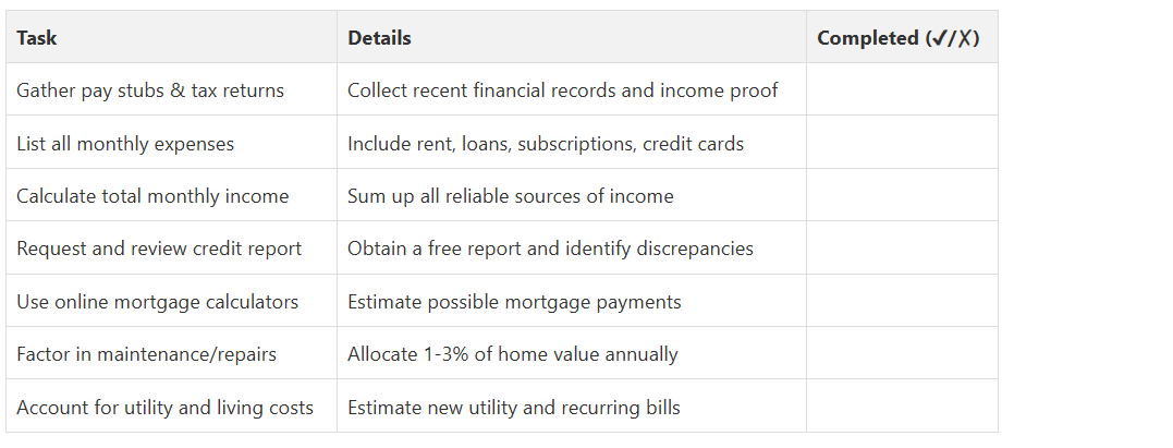 Here is a checklist to help you thoroughly assess your financial situation before starting your homebuying journey. Use this table to ensure no key financial aspect is overlooked.