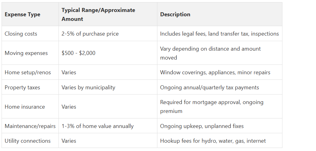 The following table outlines several additional expenses to budget for beyond the initial home price. Refer to this summary to avoid unexpected costs during your home purchase process.