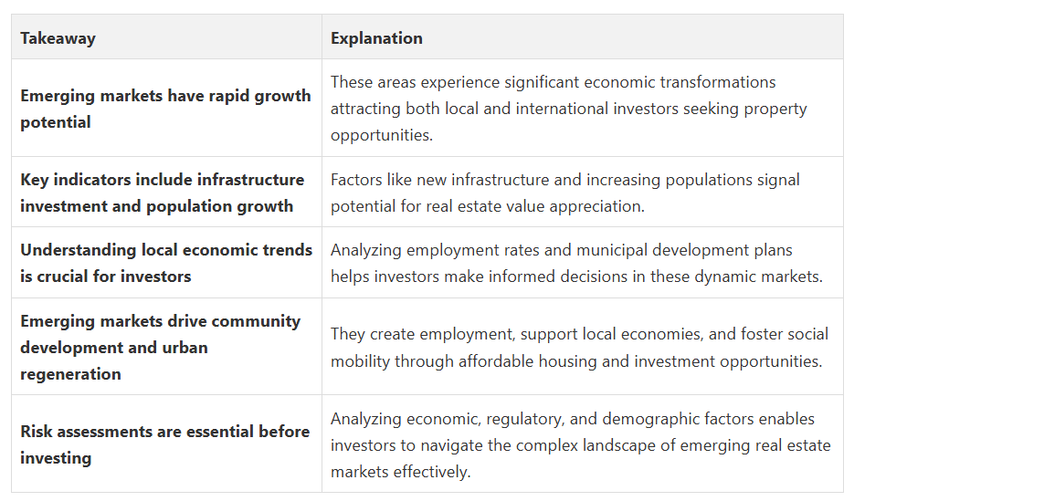 To help clarify the main characteristics that differentiate emerging real estate markets from other types of markets, the following table summarizes the key defining features discussed in the article.