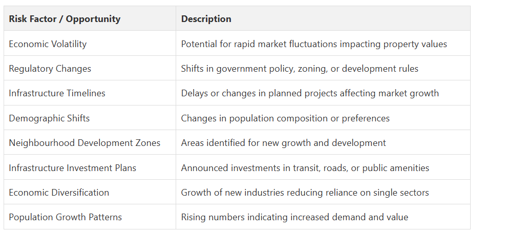 To support investors and professionals in comparing risks and opportunities within emerging real estate markets, the following table provides an at-a-glance overview of common risk factors and opportunity signals referenced in the article.