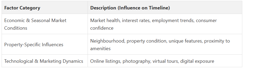 This table compares the main market factors influencing the sale timeline for homes in Ontario, helping sellers understand how different elements can impact the speed and outcome of their transaction.