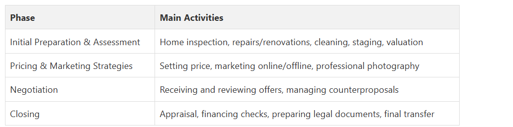 The following table summarizes the key phases of the typical home sale process in Ontario and outlines the main activities that take place in each stage.