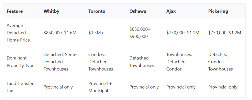 Property taxes and land transfer costs also play a role. For example, buyers in Toronto face both provincial and municipal land transfer taxes, adding thousands to closing costs. In Whitby and other Durham Region communities, only the provincial land transfer tax applies, easing the financial entry barrier. This subtle but significant difference can influence buyer decisions between these markets.