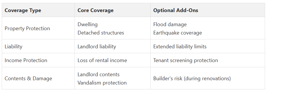 Standard rental property insurance typically includes dwelling coverage, liability insurance, loss of rental income coverage, and protection against tenant-caused damages, as well as optional add-ons such as flood damage and earthquake coverage.