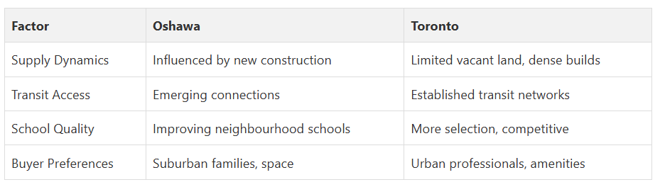 Compare key factors affecting home value in Oshawa versus Toronto: