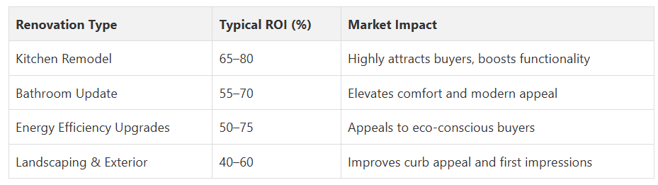 Here’s a summary of common renovation types and their typical impact on resale value: